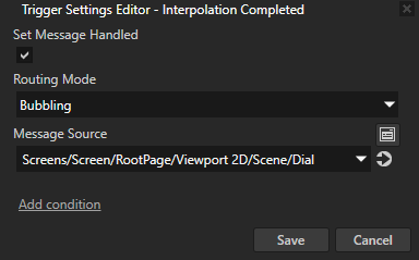 2. In the Node Components > Triggers section in the Interpolation Completed trigger click Trigger Settings and in the Trigger Settings Editor set the Message Source property to the Dial node.