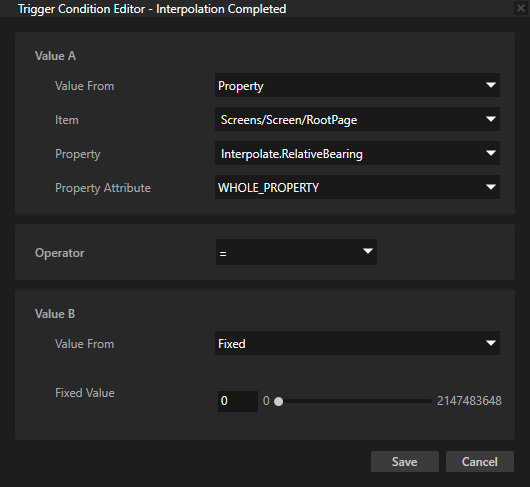 With this condition Kanzi sets off this trigger only when the value of the Interpolate.RelativeBearing property changes and when the value of the Interpolate.RelativeBearing property is not 0. When the value of the Interpolate.RelativeBearing property is not 0, the direction of travel does not align with the destination.