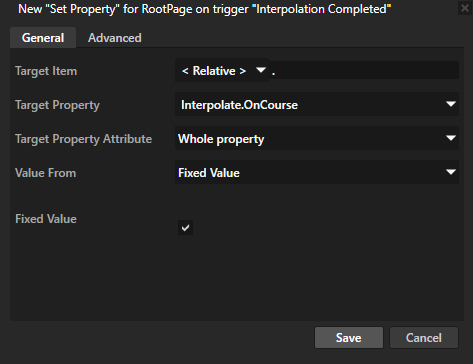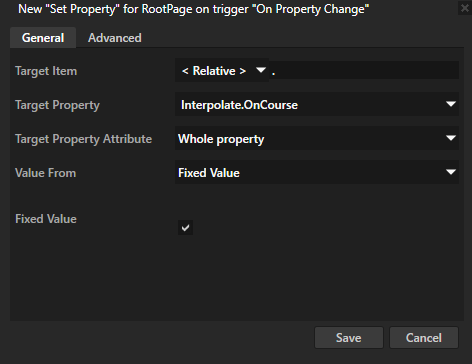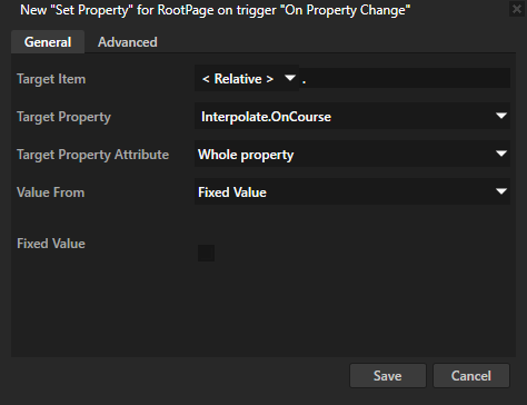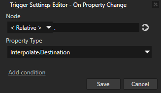 1. In the Project select the RootPage node, in the Node Components > Triggers section click Add new trigger for On Property Change, and in the Trigger Settings for the trigger that you added, set the Property Type to the Interpolate.Destination property.