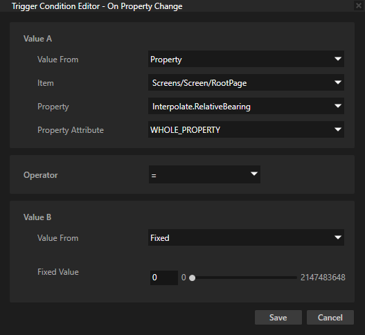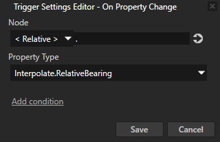 1. In the Project select the RootPage node, in the Node Components > Triggers section add the On Property Change trigger, and in the Trigger Settings set the Property Type to the Interpolate.RelativeBearing property.