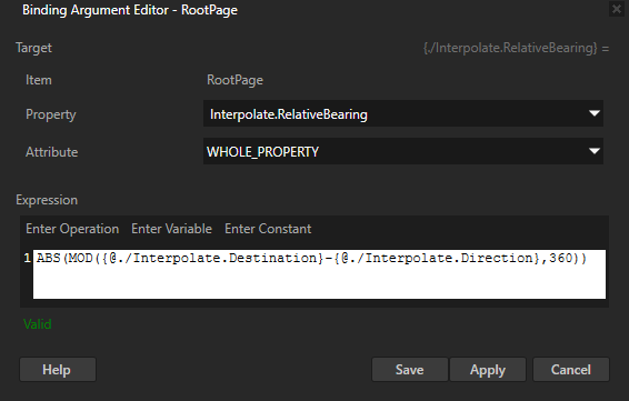 You use this binding to store the difference in degrees between the destination and the direction of travel to the Interpolate.RelativeBearing property you created in the previous step. You use the modulo function to wrap the value of Interpolate.RelativeBearing to the range from 0 to 359 degrees.