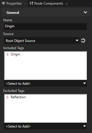 - In the Draw Objects Render Pass set Object Source to the Origin tag filter, which collects the nodes from which the reflections are made.