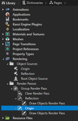 - In the Library in the Reflection render pass create a Draw Objects Render Pass, and in the Properties set Object Source to the Reflection tag filter, which collects the Instantiator nodes that represent the reflections.