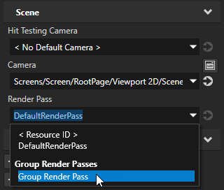 - In the Project select the Scene node and in the Properties set the Render Pass property to the Group Render Pass you created earlier in this procedure.