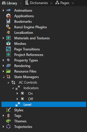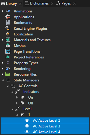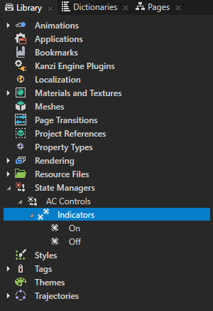 - In the Library > State Managers > AC Controls select the State Group, press F2 and rename it to Indicators, and rename the two states to On and Off.
