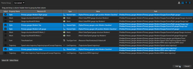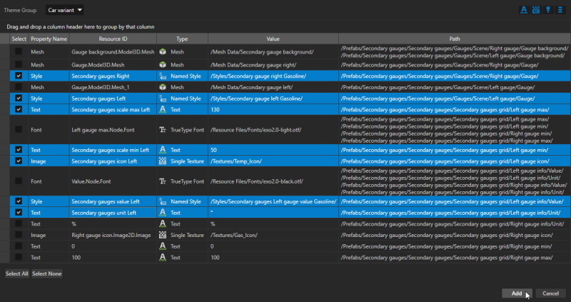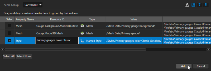 - In the Prefabs right-click Primary gauges Classic > Car and select Add Resources to a Theme Group.