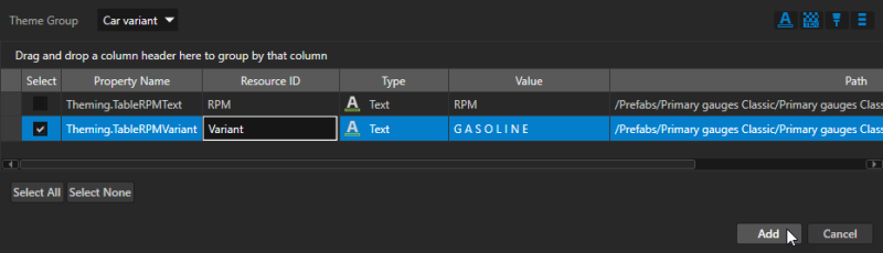 - In the Prefabs right-click Primary gauges Classic > Primary gauges grid Classic > Table RPM and select Add Resources to a Theme Group.