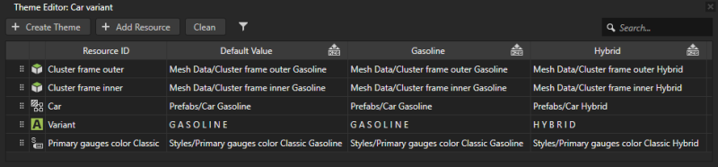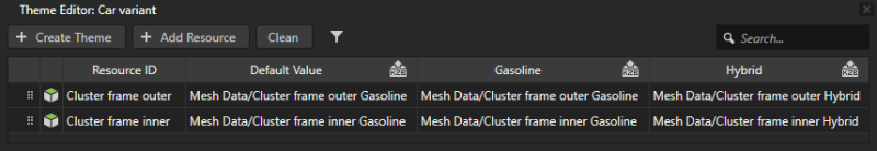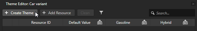- Open the Car variant theme group in the Theme Editor and create two themes: Gasoline and Hybrid.