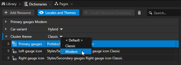 - (Optional) In the Dictionaries set the Cluster theme to Modern so that you can see in the Preview the changes you make to the Primary gauges Modern prefab.