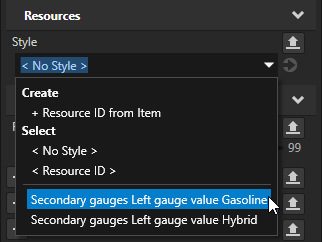 - In the Prefabs select the Secondary gauges > Secondary gauges grid > Left gauge info > Value, in the Properties add the Style property, and set it to the Secondary gauges Left gauge value Gasoline style.