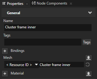 - In the Prefabs select Primary gauges Modern > Gauges > Scene > Cluster frame inner and in the Properties set the Mesh property to <ResourceID> and use the Cluster frame inner resource ID.