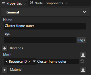 - In the Prefabs select Primary gauges Modern > Gauges > Scene > Cluster frame outer and in the Properties set the Mesh property to <ResourceID> and use the Cluster frame outer resource ID.
