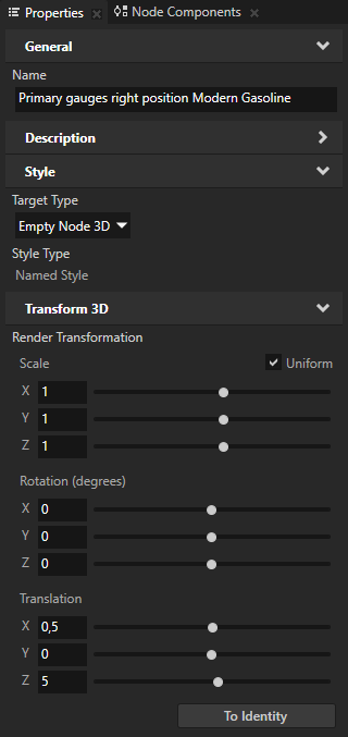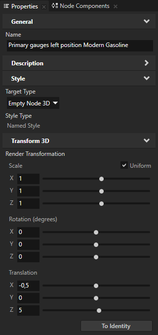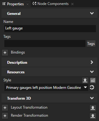 - Repeat the previous two steps for the Primary gauges Modern > Gauges > Scene > Left gauge node, but use the Primary gauges left position Modern Gasoline style.