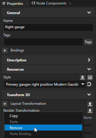 - In the Primary gauges Modern > Gauges > Scene > Right gauge and Left gauge nodes replace the Render Transformation property with a style: