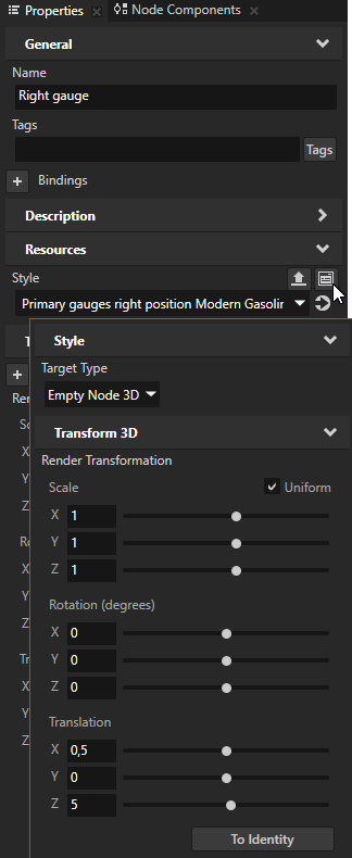 - In the Prefabs select the Primary gauges Modern > Gauges > Scene > Right gauge, in the Properties add the Style property, and set it to the Primary gauges right position Modern Gasoline style.