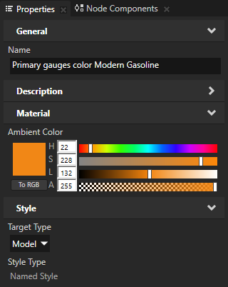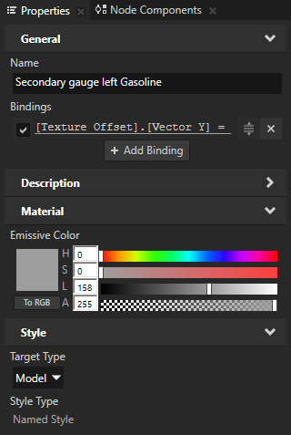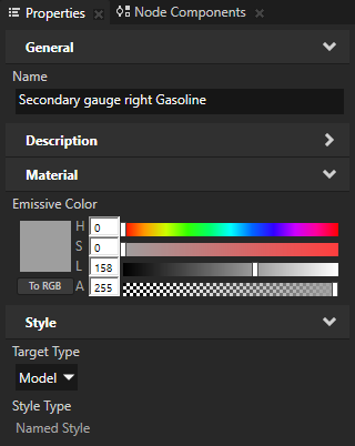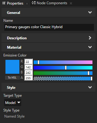 This style sets the Emissive Color property for the material which the Gauge Model node which defines the right secondary gauge uses.