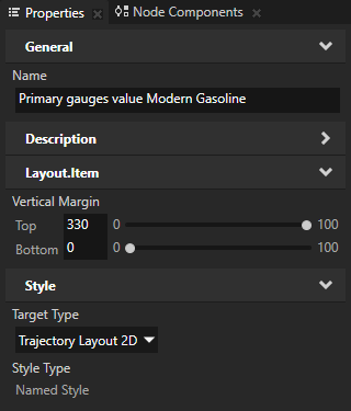 This style sets the position of the Speed value trajectory and RPM value trajectory Trajectory Layout nodes using the Vertical Margin property. The primary gauge speed and RPM values move along these Trajectory Layout nodes.