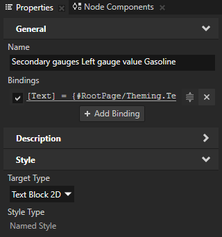 The Secondary gauges Left gauge value Gasoline style targets only the Text Block 2D nodes and uses a binding to get the value for the engine temperature gauge from the Temperature property in the RootPage node.