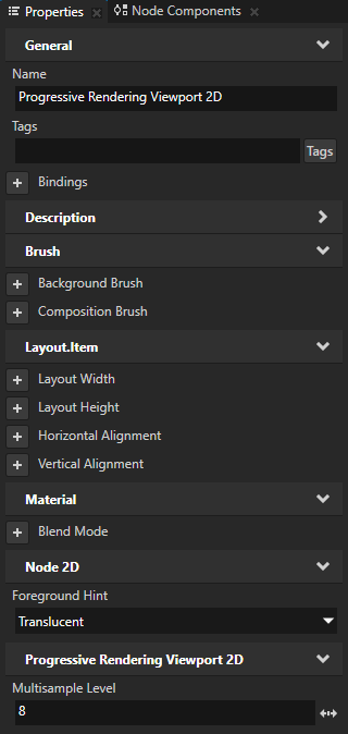 To apply anti-aliasing to the content rendered by a Progressive Rendering Viewport 2D node, in the Project select the Progressive Rendering Viewport 2D node, in the Properties add the Multisample Level property, and set it to the number of anti-aliasing samples that you want to use.