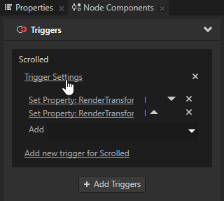 For example, create a Scroll View 2D node with a Scrolled trigger and in the Node Components click Trigger Settings for that trigger. See Using the Scroll View nodes.