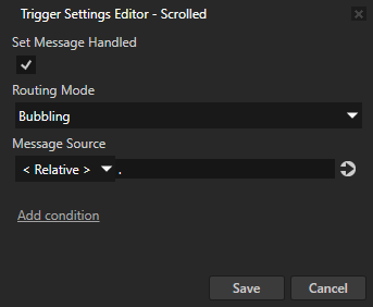 - When you enable the Set Message Handled property, this trigger intercepts and handles the message. The message stops here, and does not continue neither bubbling nor tunneling in the project tree.