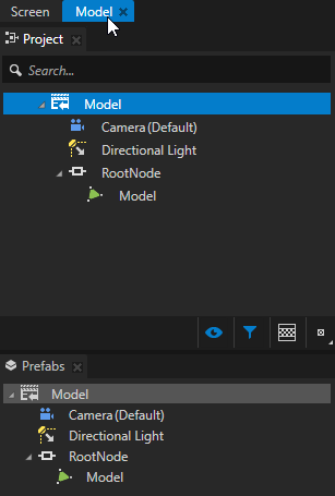 • In the Prefabs a new Scene prefab named after the imported file. In that Scene prefab Kanzi Studio creates the scene hierarchy from the imported file and places the assets from the imported file into that prefab.