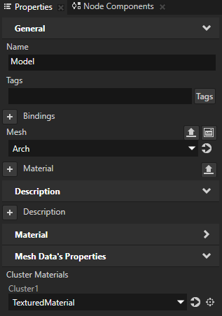6. In the Prefabs select the Model node, in the Properties add the Bindings property, and in the Binding Argument Editor set:
