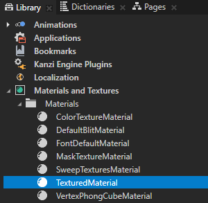 • In the Library Kanzi Studio places all resources from the imported file, such as Meshes, Splines, Animations, and Materials.