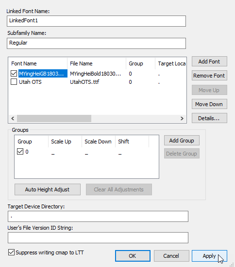 3. In the Font Link window for each ttf font file you imported in the previous step enable the checkbox and click Apply. After you add all the fonts that you want to link, click OK.