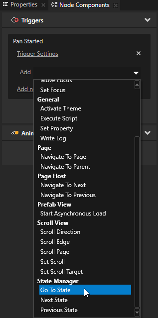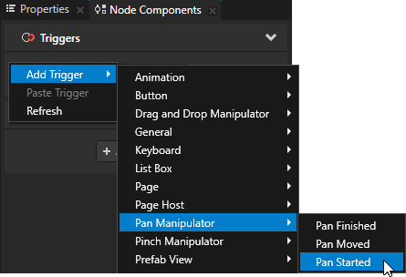 1. In the Project select the node to which you want to add the trigger, and in the Node Components > Triggers section add one of the Pan Manipulator triggers.