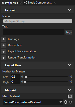 - In the Project select the 3D nodes the appearance of which you want to adjust, and in the Properties set the Mesh Material or Material property to the material that you want to use. For primitive meshes use the Mesh Material property, for Model nodes use the Material property.