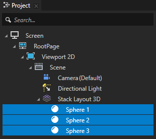 For example, press Alt and right-click the Scene node, create a Stack Layout 3D node and inside it create three Sphere nodes.