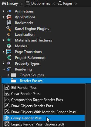 - In the Library > Rendering press Alt and right-click Render Passes, select Group Render Pass, and name it Stencil Render Pass.