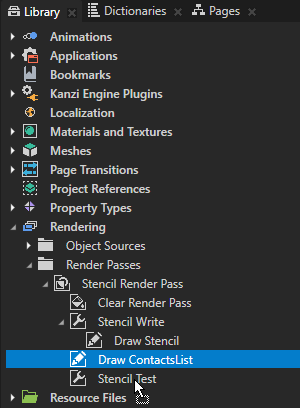 - In the Library > Rendering > Render Passes > Stencil Render Pass create a Pipeline State Render Pass, name it Stencil Test, and drag the Draw ContactsList render pass to the Stencil Test render pass.