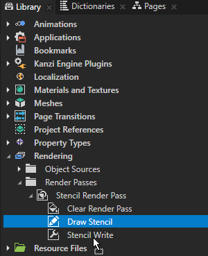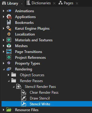 - In the Library > Rendering > Render Passes > Stencil Render Pass create a Pipeline State Render Pass, name it Stencil Write, and drag the Draw Stencil render pass to the Stencil Write render pass.