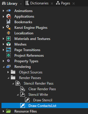 - In the Library > Rendering > Render Passes > Stencil Render Pass create a Draw Objects Render Pass, name it Draw ContactsList, in the Properties add the Object Source property, and set it to the Content FilterTag Filter.