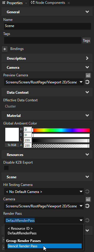 - In the Project select the Scene node which contains the Stencil node and the node to which you want to apply the stencil, and in the Properties set the Render Pass property to the Stencil Render Pass.