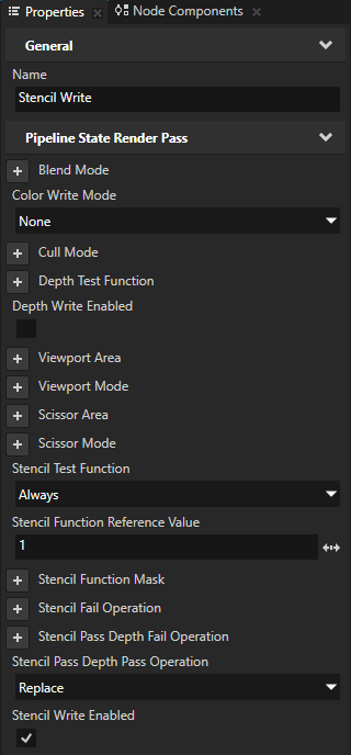 - In the Library > Rendering > Render Passes > Stencil Render Pass select Stencil Write, and in the Properties add and set: