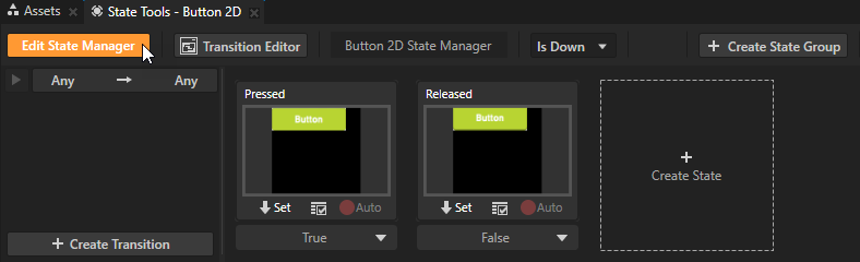 - In the Project select the Button 2D node and in the State Tools click Create State Manager.