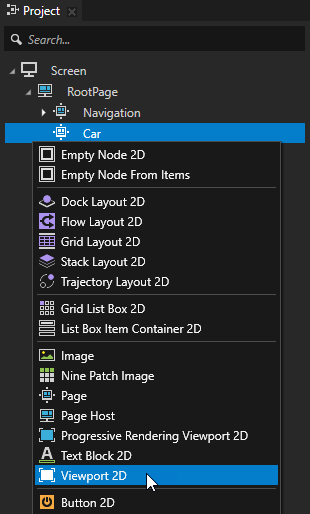 - In the Project press Alt and right-click the Car node and select Viewport 2D.