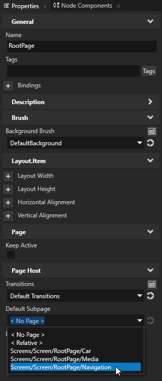 When you activate the Page node where you set the Default Subpage property Kanzi activates the selected Page node. For example, when you set the Page node as the default subpage of the RootPage Page node, when you start the application Kanzi shows the Page node.