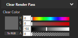 - In the Clear Render Pass that you created earlier in this procedure add and set the Clear Color property to produce meaningful color output, including the alpha channel.