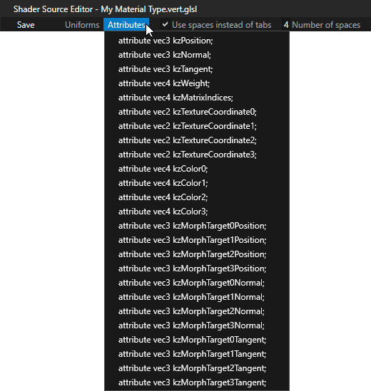 - When editing shaders in the Kanzi Studio Shader Source Editor use the Uniforms and Attributes buttons to quickly add code snippets for declaring uniforms and attributes at the current cursor position.