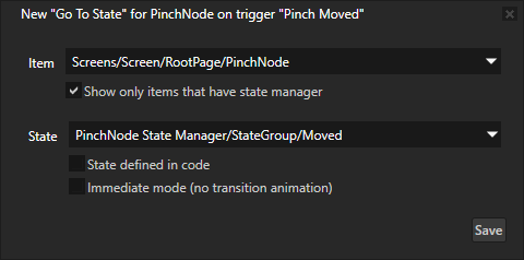 For example, create a state manager where you define the states which set the appearance of a node when the Pinch Moved and Pinch Finished triggers are set off. See Creating a state manager.