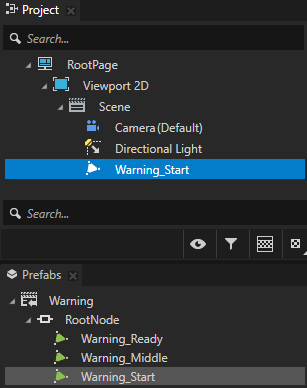 For example, in the Prefabs copy the Warning_Start node and in the Project paste it to the Scene node.