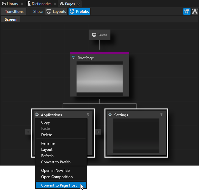 TIPWhen you click any Page or Page Host node in the Pages window, Kanzi transitions to that node and you can see the transition in the Preview.