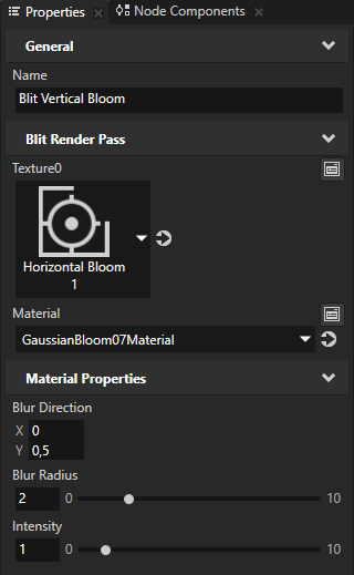 - In the Library select the Vertical Bloom 1 > Blit Horizontal Bloom render pass and in the Properties set: