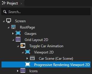 - In the Project select the RootPage > Grid Layout 2D > Toggle Car Animation > Viewport 2D > Car Scene node and in the Properties set the Render Pass property to Progressive Rendering.