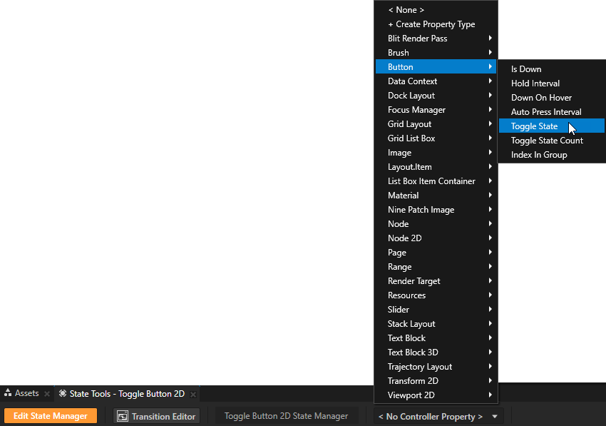 - In the State Tools click the <No Controller Property> dropdown menu and select the Button > Toggle State property.