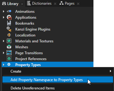 To move in your Kanzi Studio project all custom property types to the project property namespace, in the Library right-click Property Types and select Add Property Namespace to Property Types.